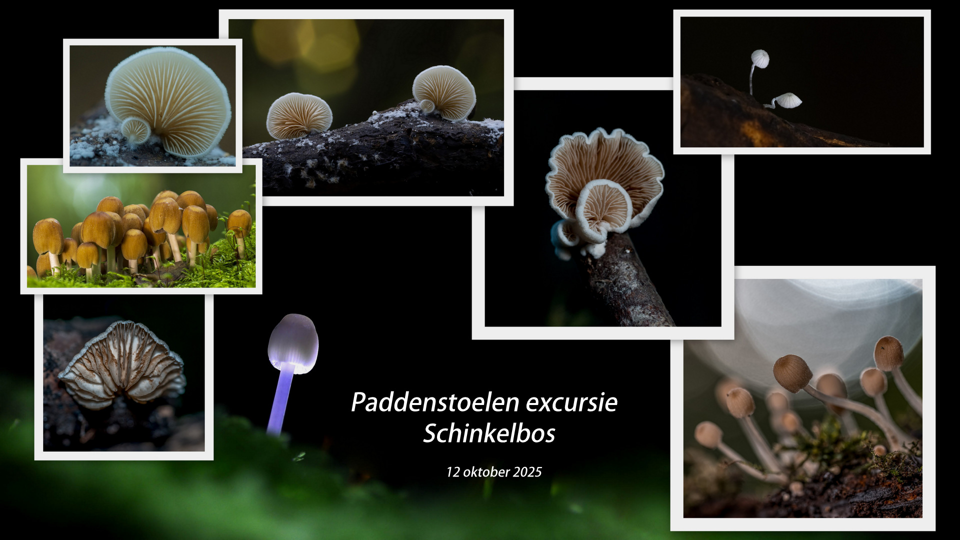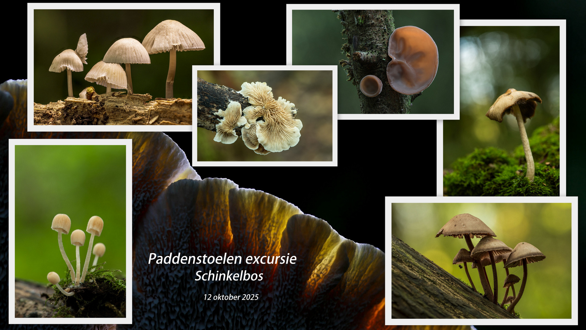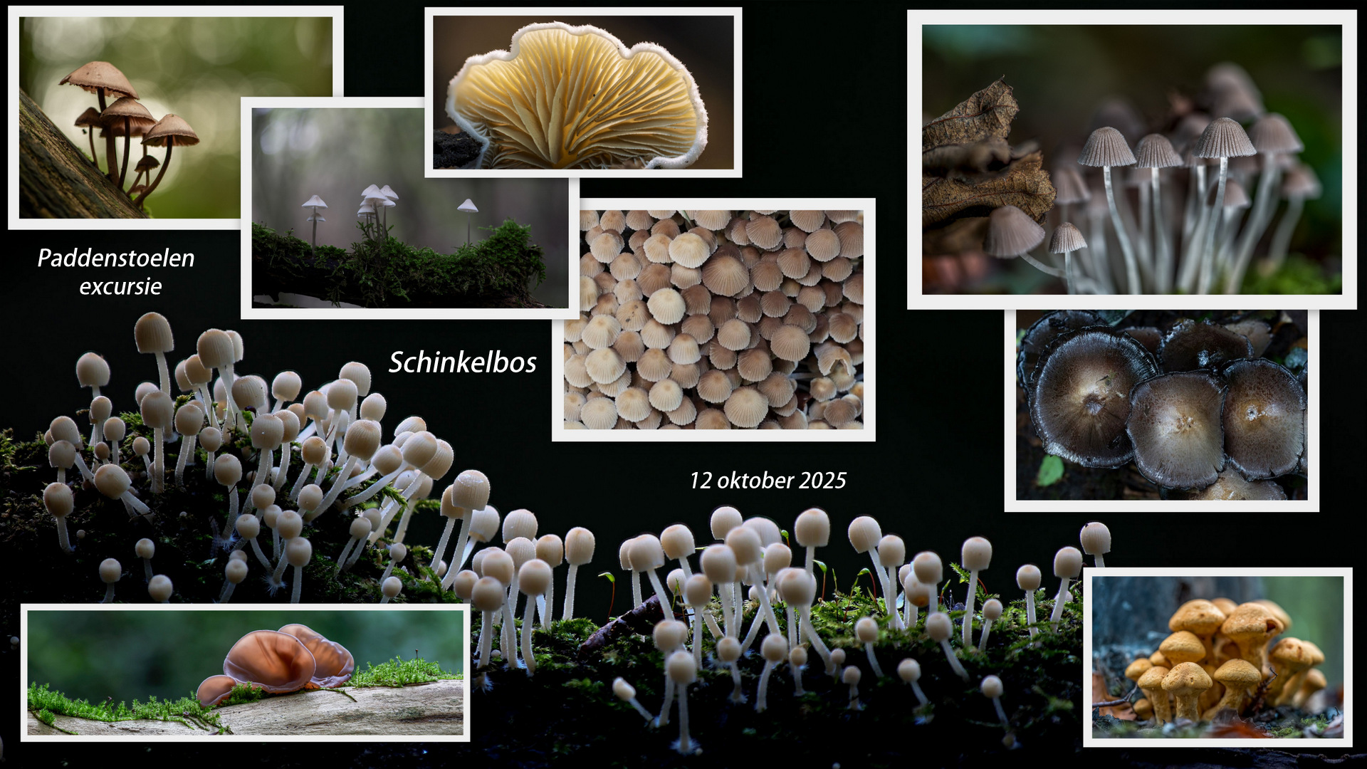 Clubactiviteiten Paddenstoelen excursie Schinkelbos - 2025 Hierna de collages van een heerlijke zondagochtend.Piet, Marian, Paul, Johnny, Marga en ik gingen los op de paddenstoelen in het Schinkelbos. terug